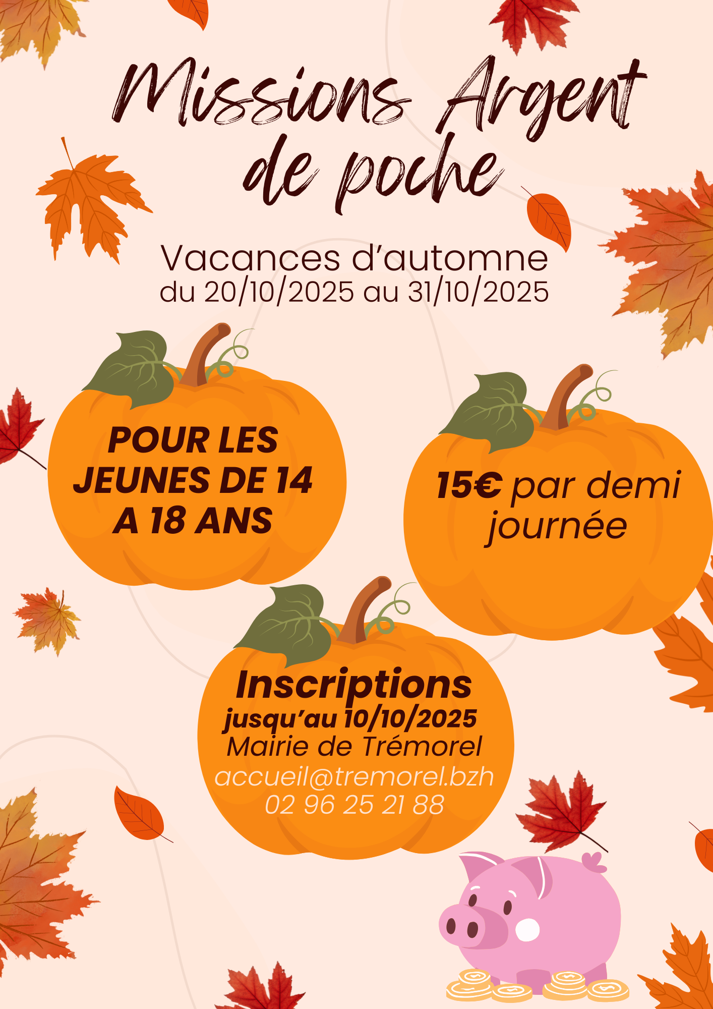 Durant les vacances d'automne, venez travailler entouré de nos agents municipaux ! Uniquement pour les jeunes de 14 à 18 ans. Les dossiers sont à retirer en mairie ; les inscriptions se terminent le vendredi 10 octobre.
